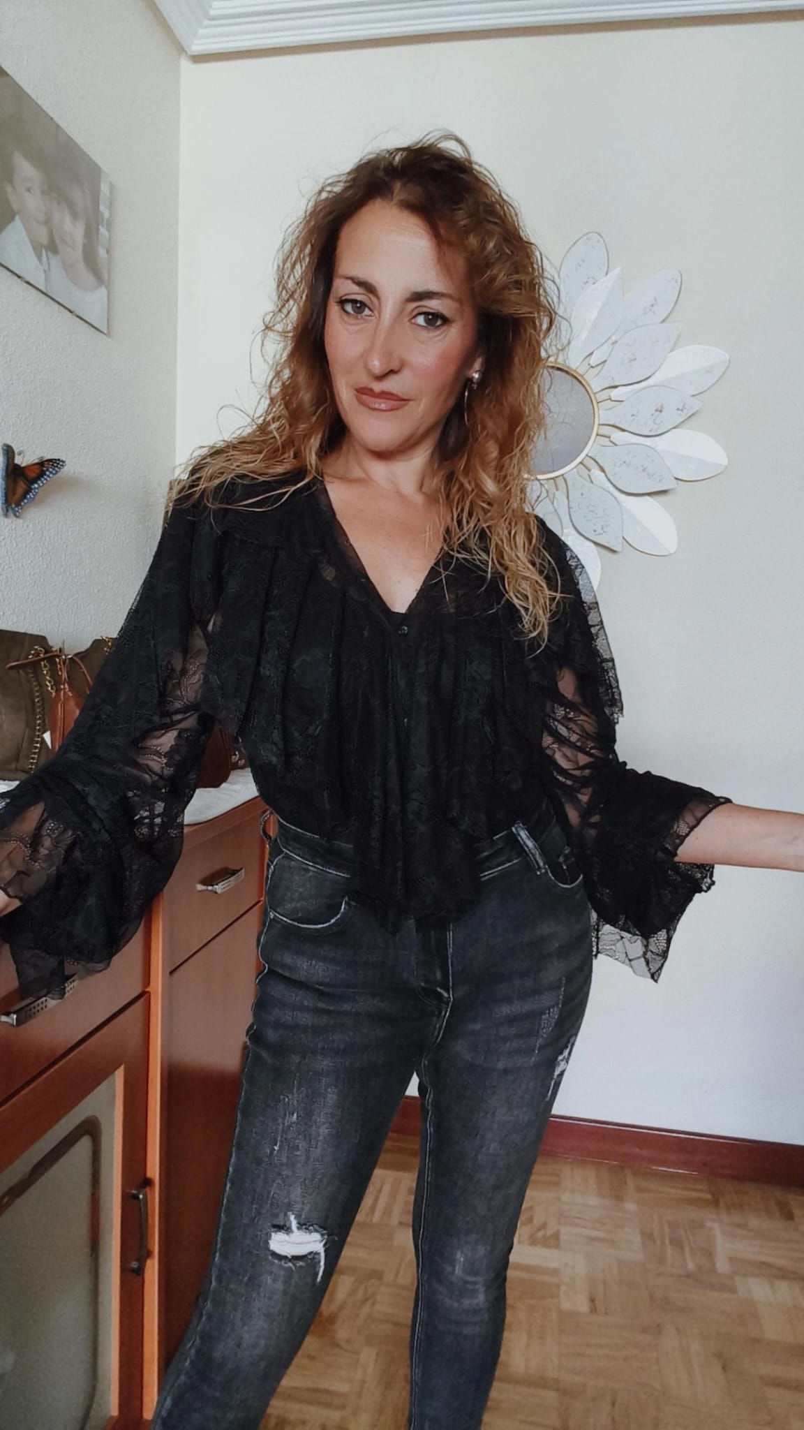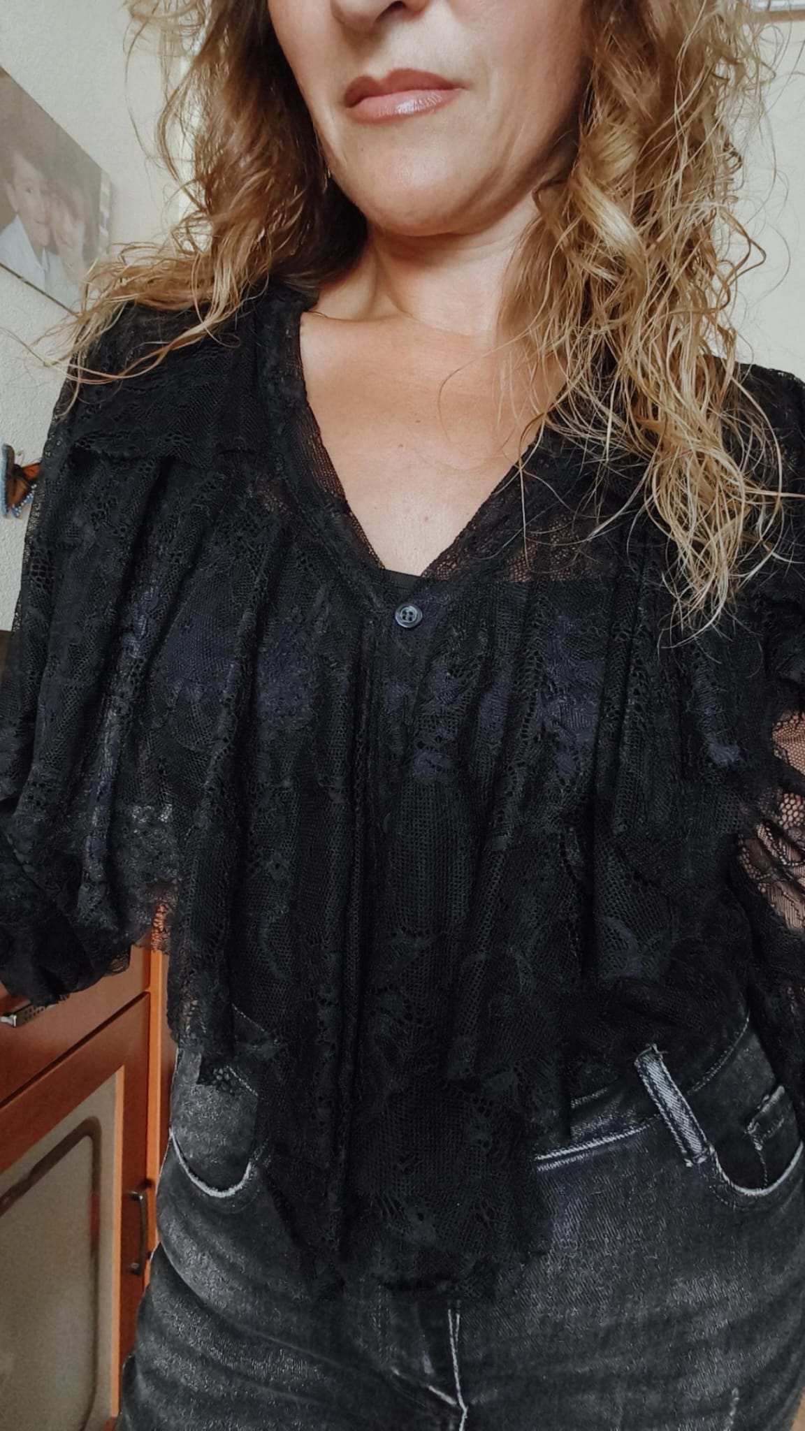Camisa negra de encaje con volantes. Talla única ideal hasta 110 de contorno. Es una camisa con un encaje muy suave y muy elegante. Ideal con vaqueros para un look más informal y con un look más arreglado para vestir.