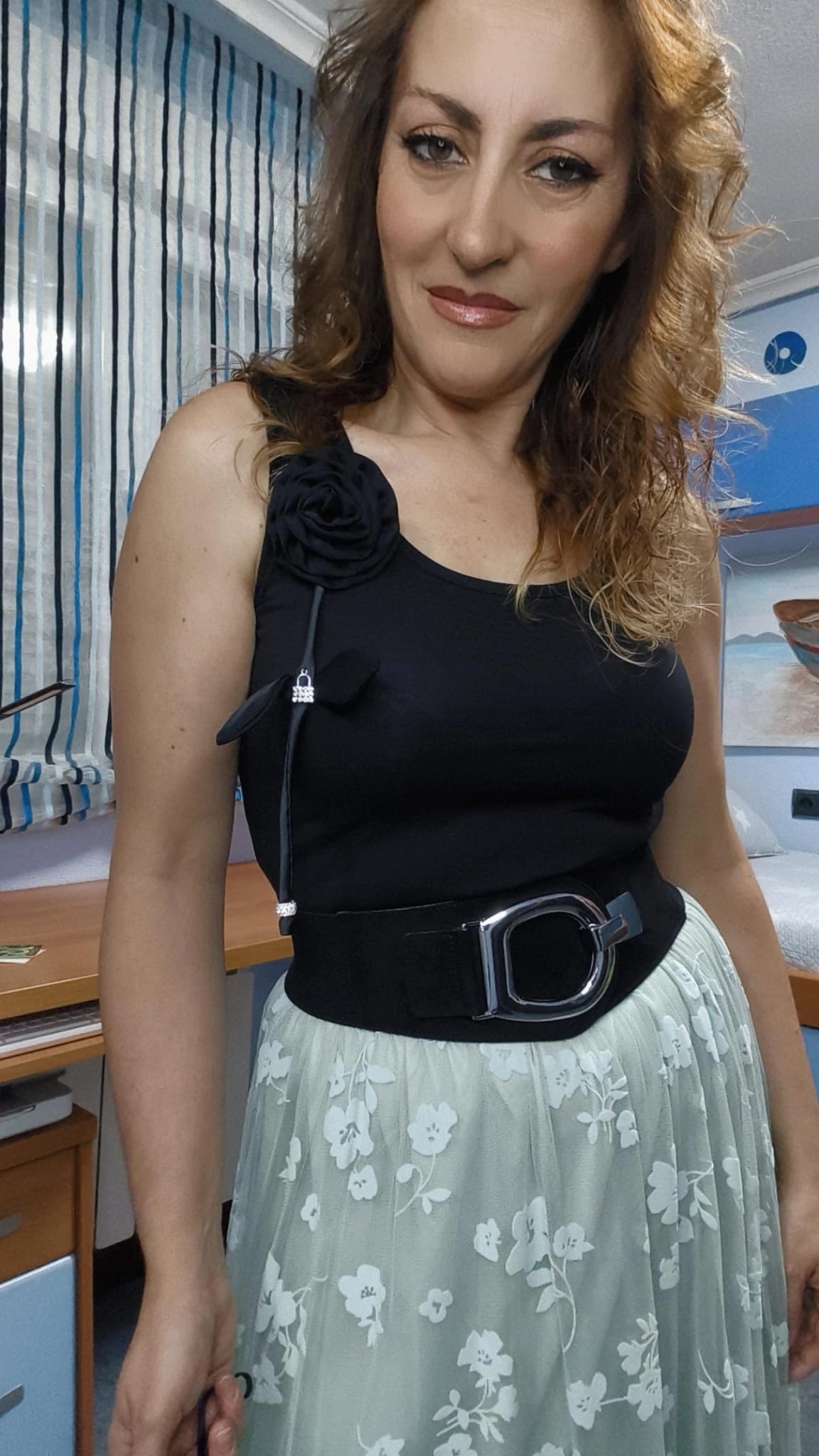Camiseta básica de algodón con detalle de flor que se puede quitar para hacerla más casual o más formal. Algodón de muy buena calidad. Elástica. Talla única. Medida de contorno de pecho 80 sin estirar y 100 estirada. Largo 63 centímetros.