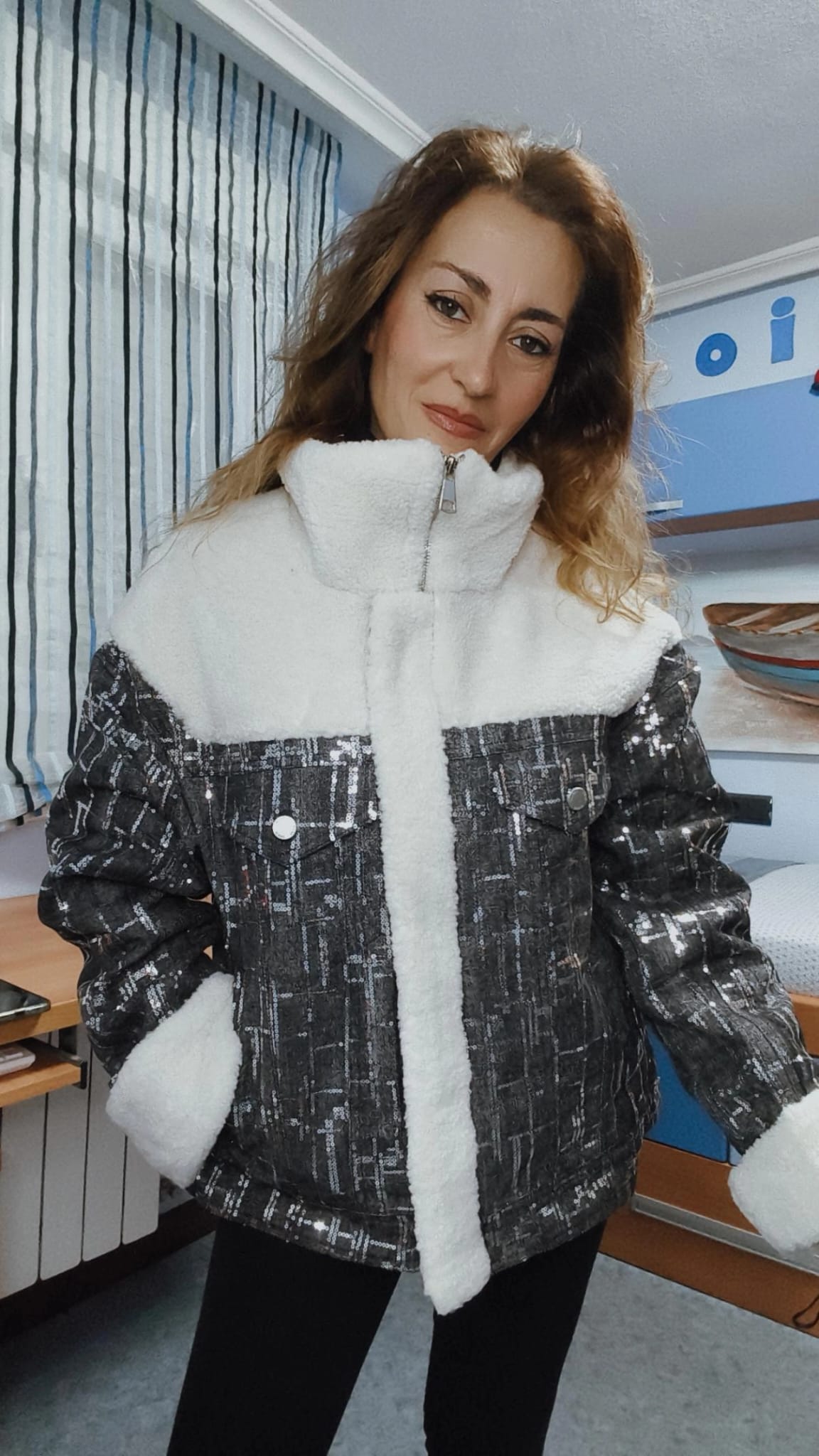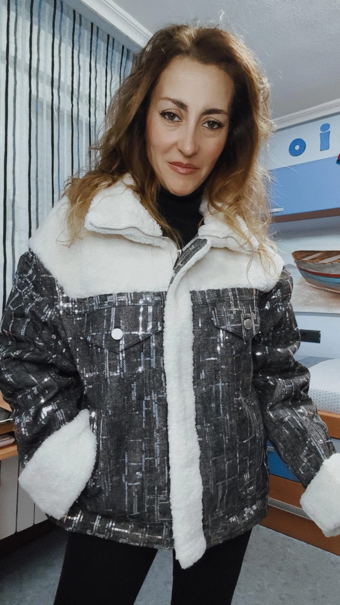 Cazadora denim combinada con borreguito. Color gris con lentejuelas plata. Talla única ideal hasta talla 44. Forro interior. Cremallera hasta convertirla en cuello alto.