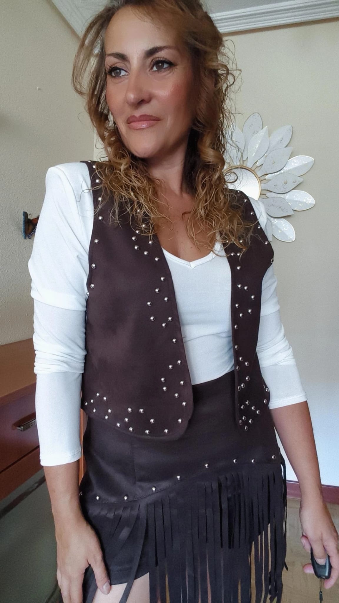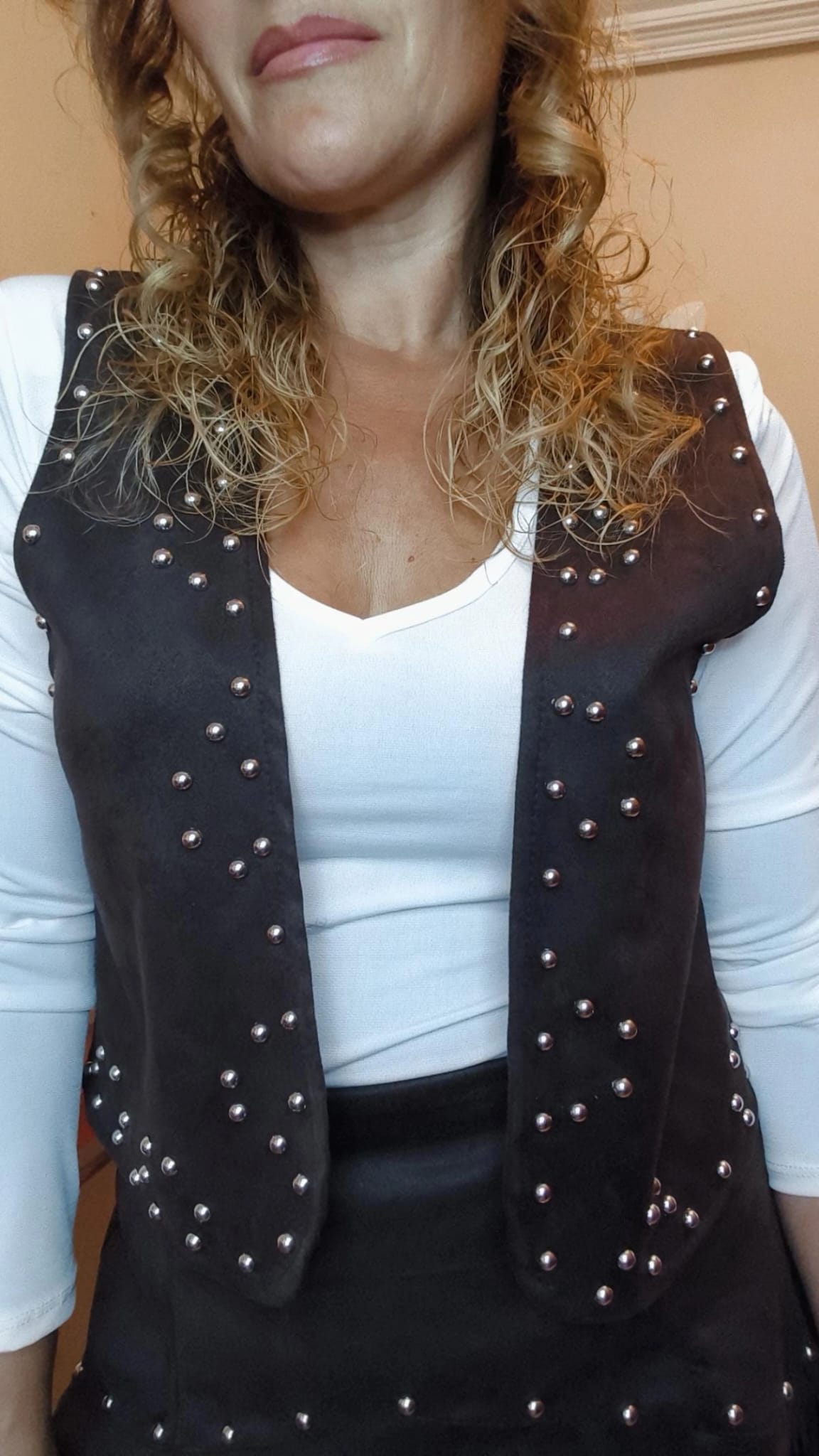 Chaleco de antelina color marrón chocolate con tachuelas en plateado. Talla única. No se abrocha. Super cómodo y juvenil