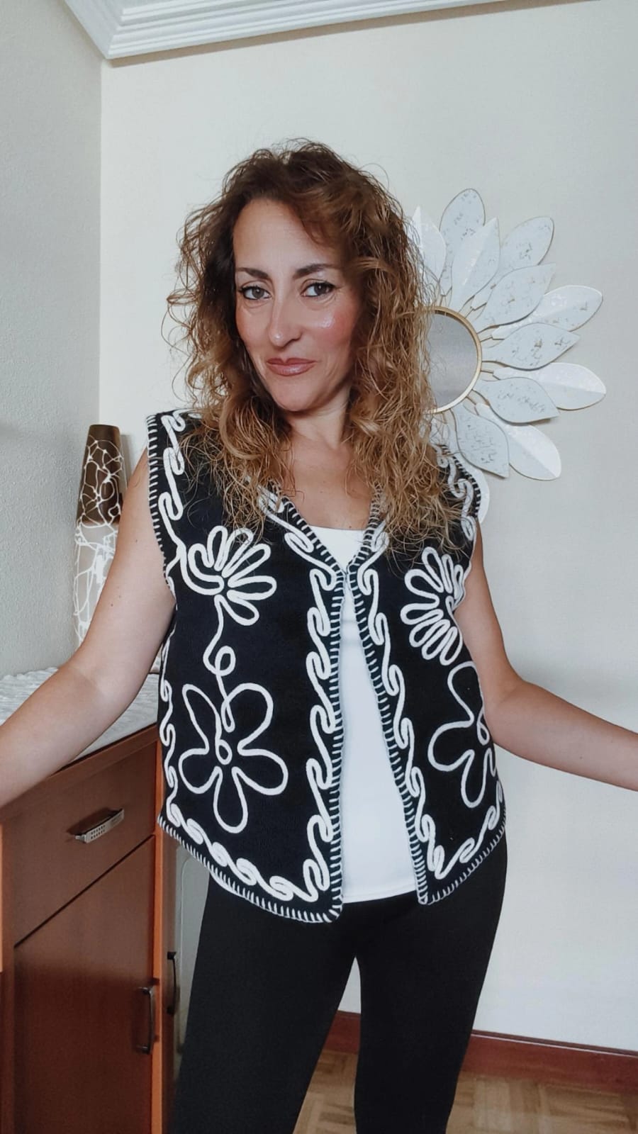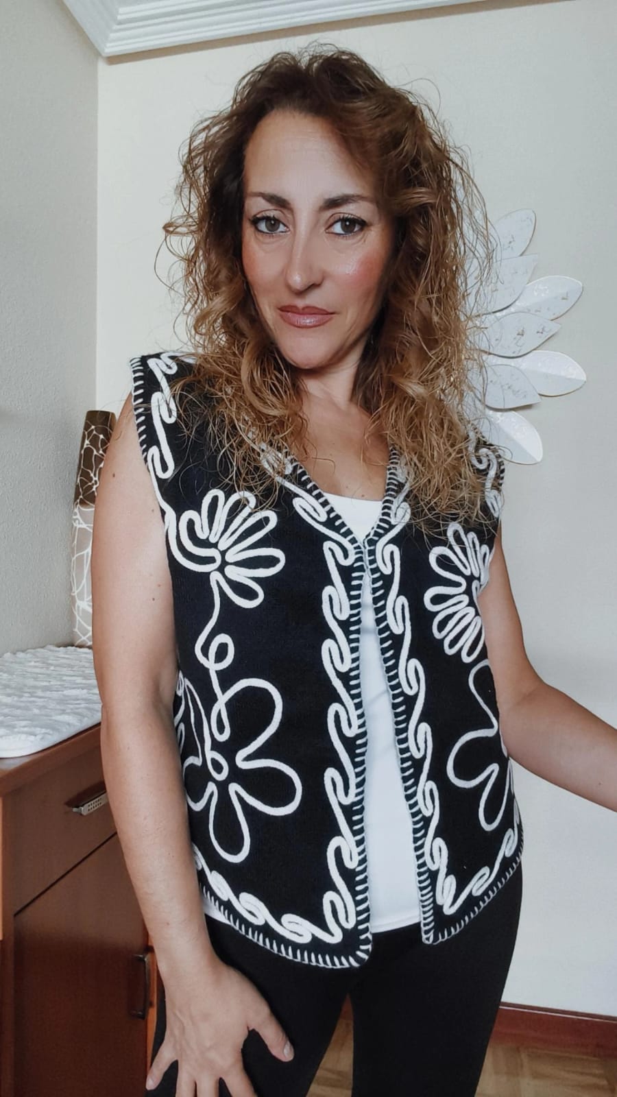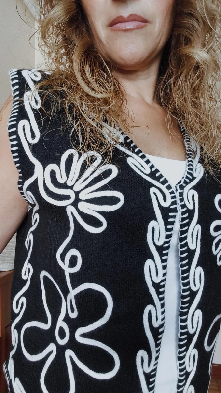 Chaleco de punto negro con bordados en blanco. Talla única. Da talla perfectamente hasta una talla 42 y dejándolo abierto hasta una 44. Tacto suave de calidad.