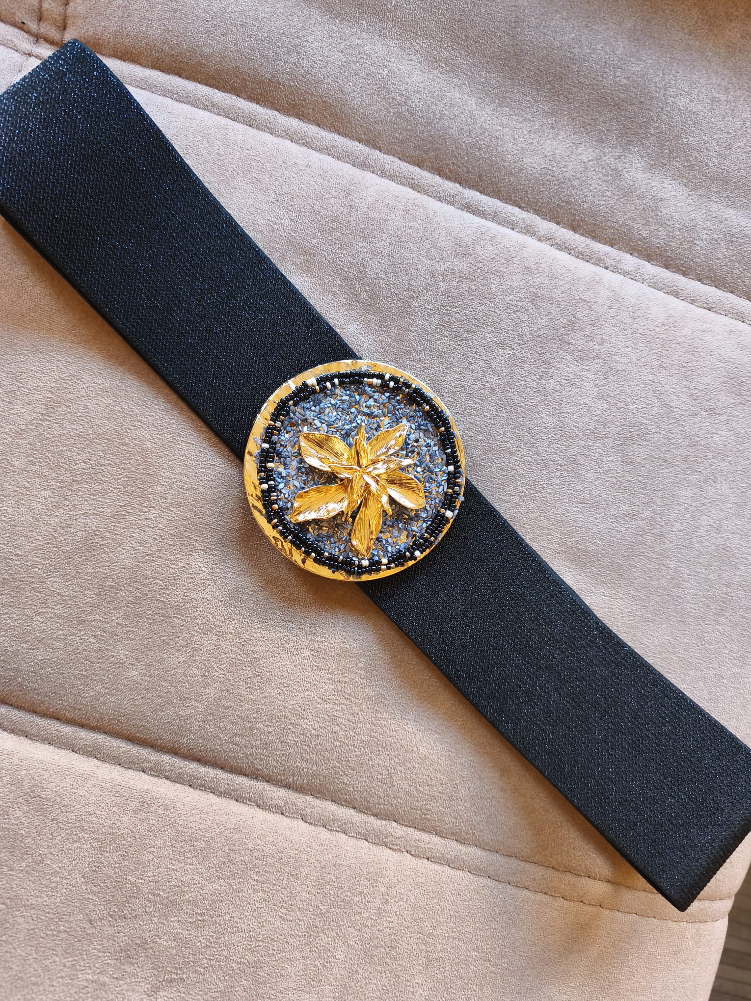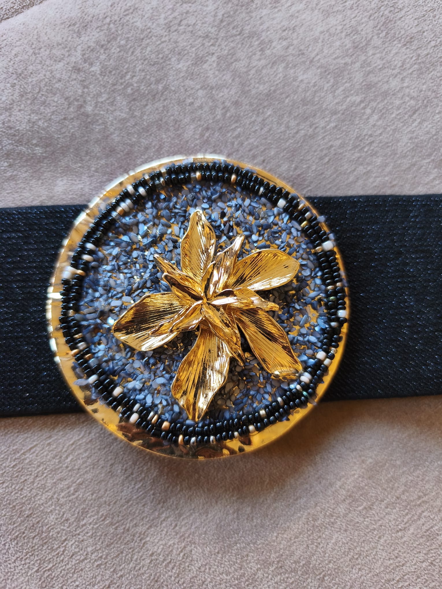 Cinturón elástico negro con broche dorado y azul y una flor dorada. Talla única