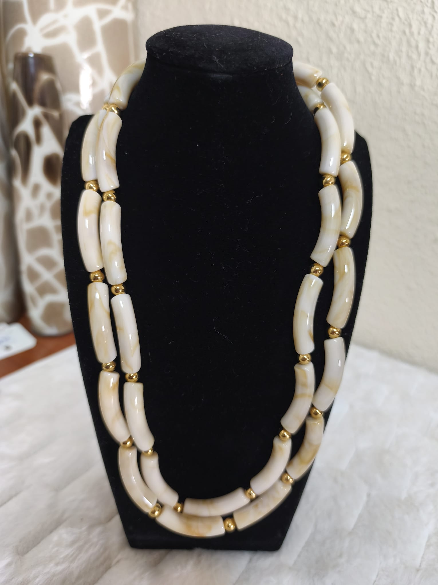 Colgante con efecto doble vuelta color beige con perlas doradas entre cada pieza. Cierre de acero