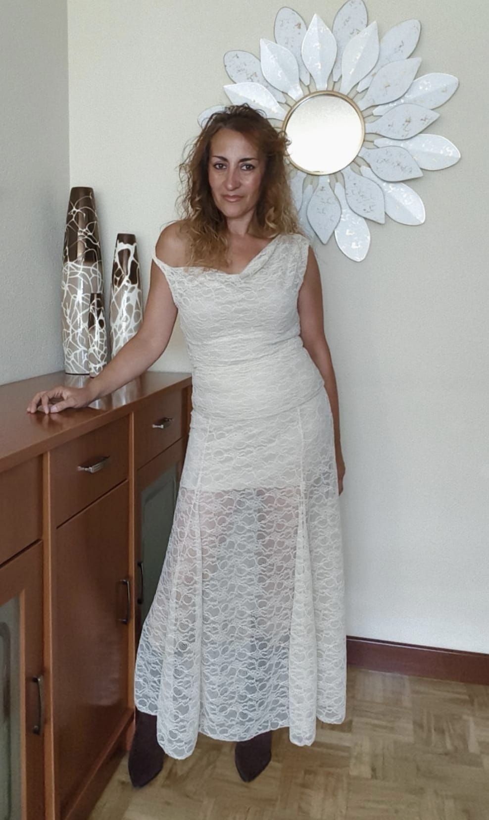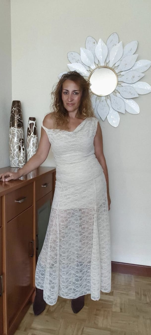 Conjunto de encaje beige compuesto por una falda larga con goma en la cintura y forro interior corto para no transparentar ropa interior. La parte de arriba es una blusita con forro y tirantes asimétricos que permiten jugar con la forma del escote pudiéndolo llevar en el hombro o dejarlo caer de un lado para darle otro toque. Es talla única pero solo se aconseja hasta una talla máxima de 38