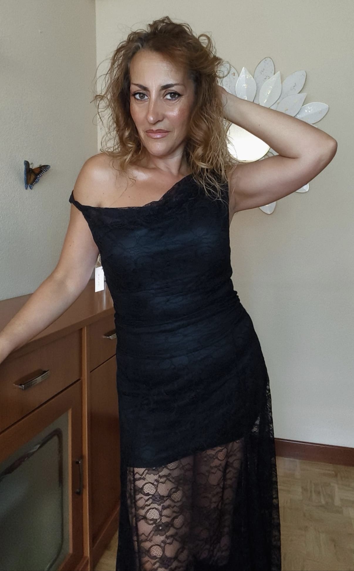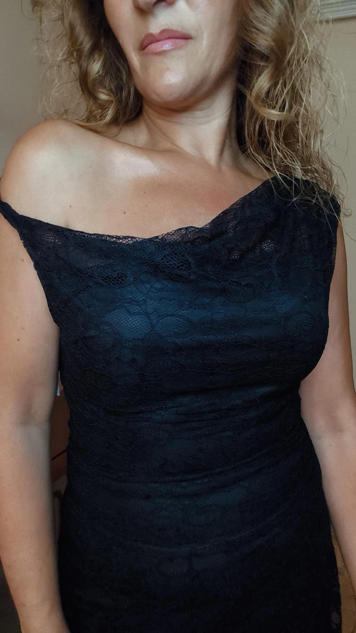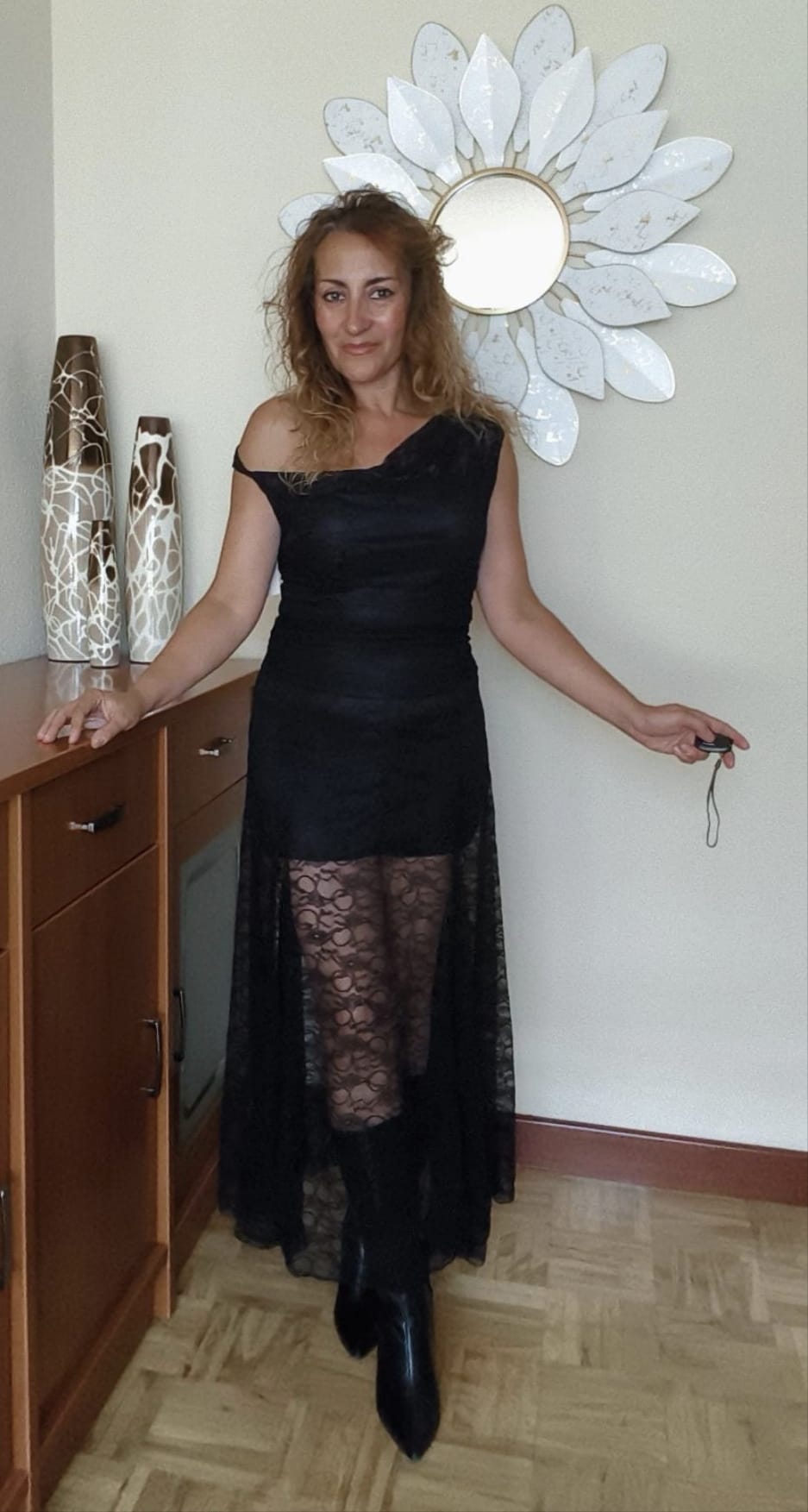 Conjunto de encaje negro compuesto por una falda larga con goma en la cintura y forro interior corto para no transparentar ropa interior. La parte de arriba es una blusita con forro y tirantes asimétricos que permiten jugar con la forma del escote pudiéndolo llevar en el hombro o dejarlo caer de un lado para darle otro toque. Es talla única pero solo se aconseja hasta una talla máxima de 38