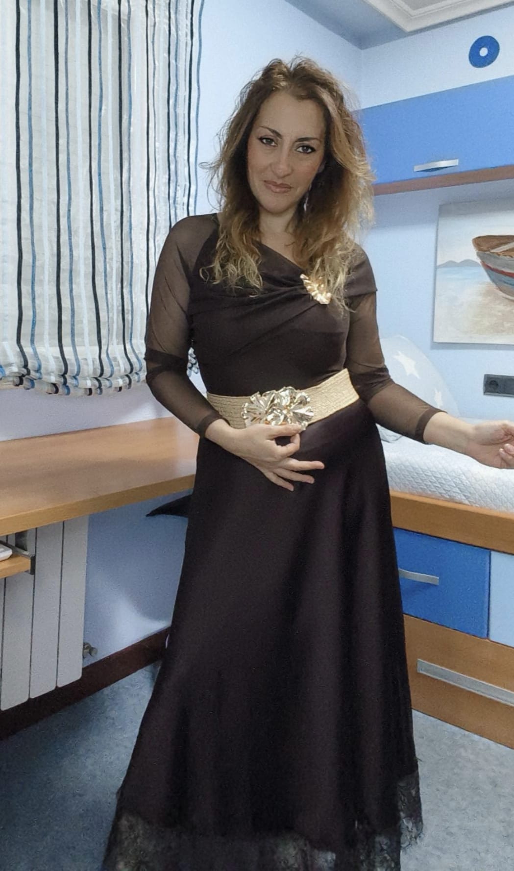 Falda de rasón en color chocolate con encaje negro. Con un poquito de capa que le da un bonito movimiento. Cintura engomada. Ideal desde talla 38 hasta talla 42.
