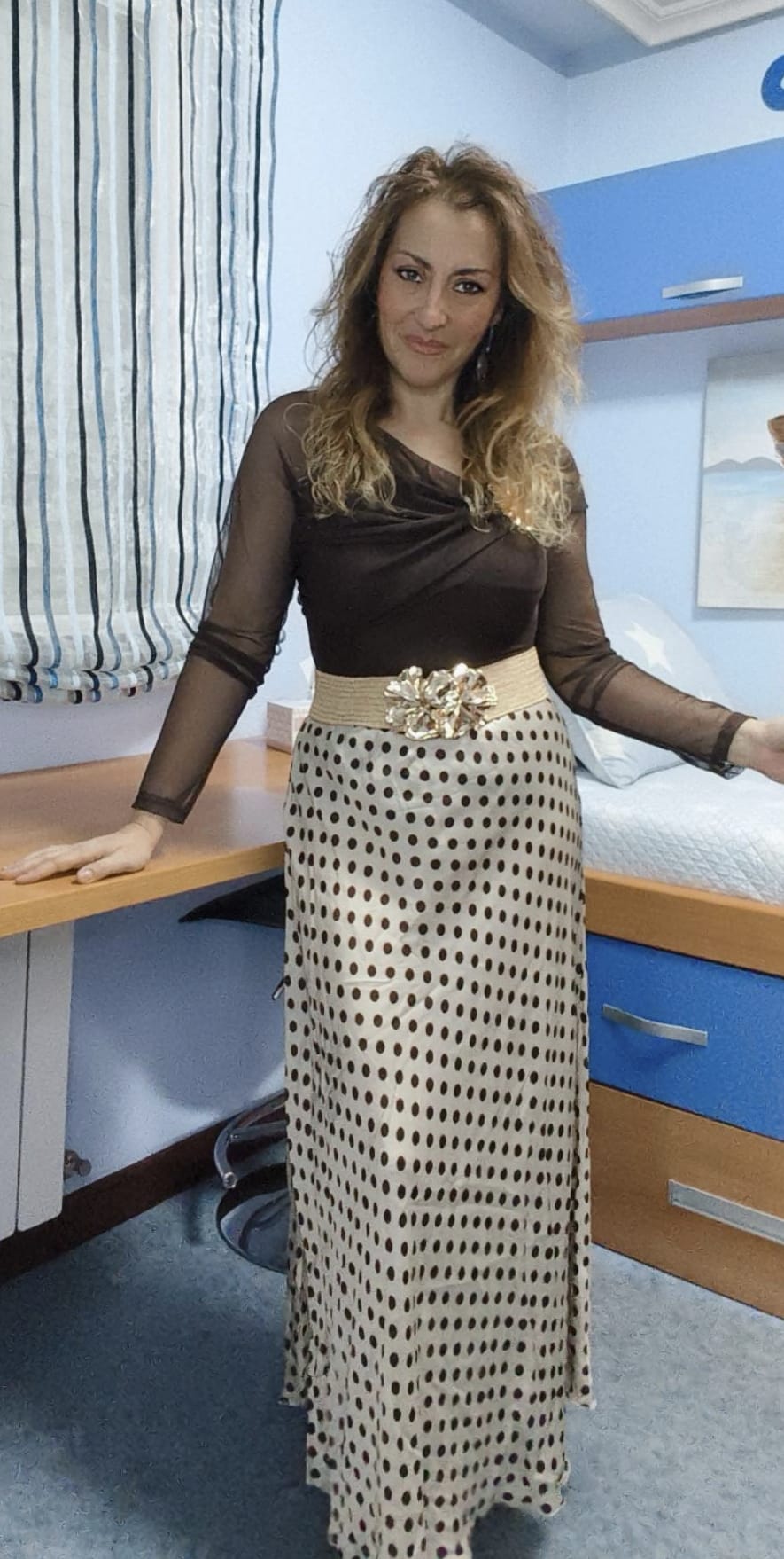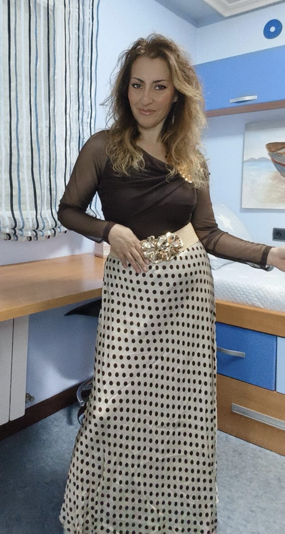 Falda de raso con fondo beige y lunares color chocolate. Cintura engomada. Ideal desde talla 38 hasta talla 42.
