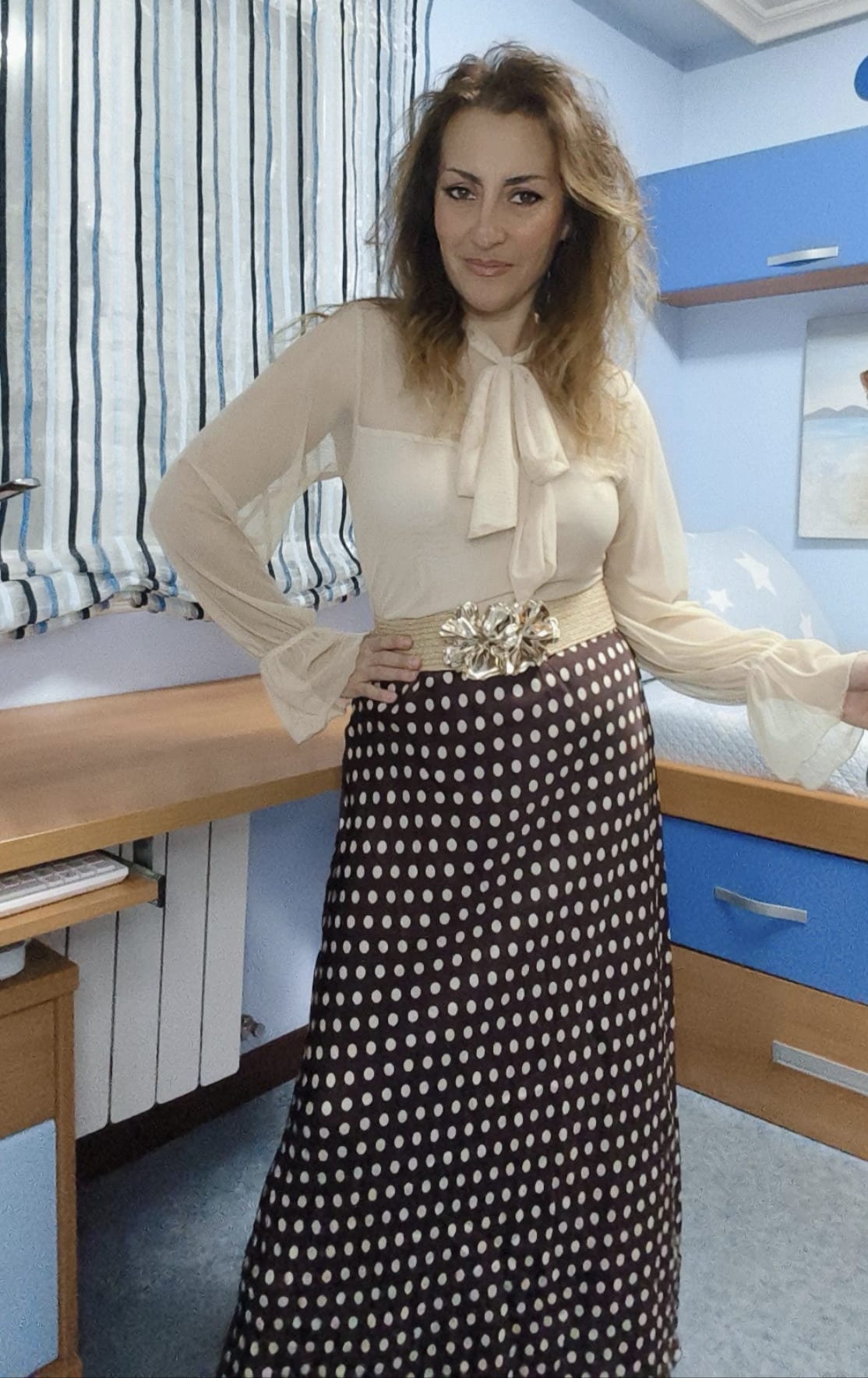 Falda de raso con fondo chocolate y lunares color beige. Cintura engomada. Ideal desde talla 38 hasta talla 42.