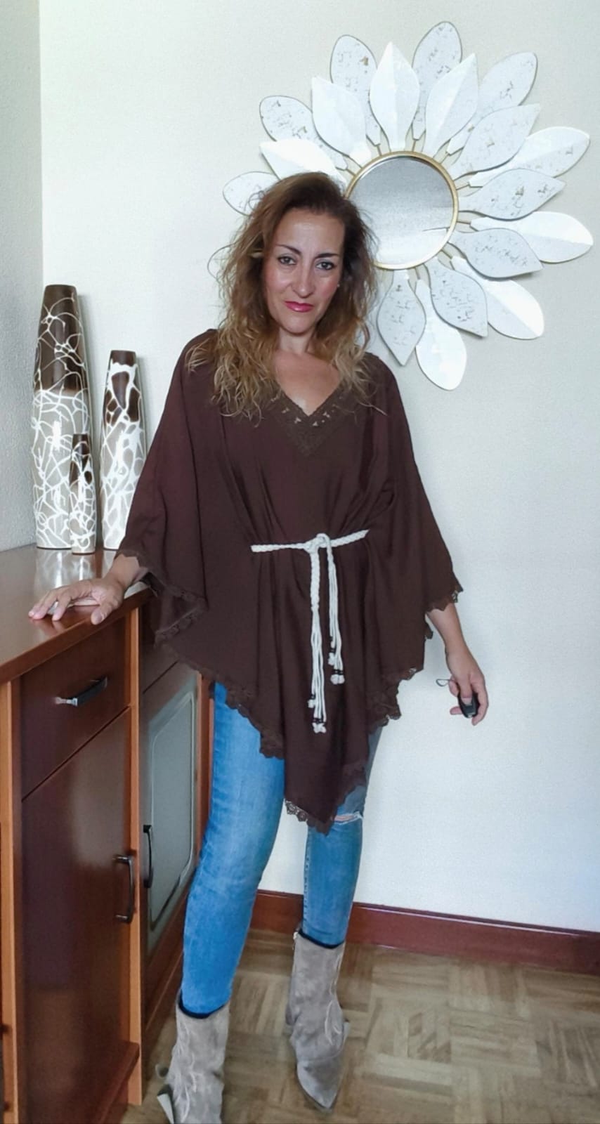 Poncho de color chocolate. Talla única. Con cordón en color beige para ajustar a cada medida. Todo el escote en V bordes con detalles de puntilla. Es un prenda muy cómoda y estilosa que se adapta a cualquier talla.