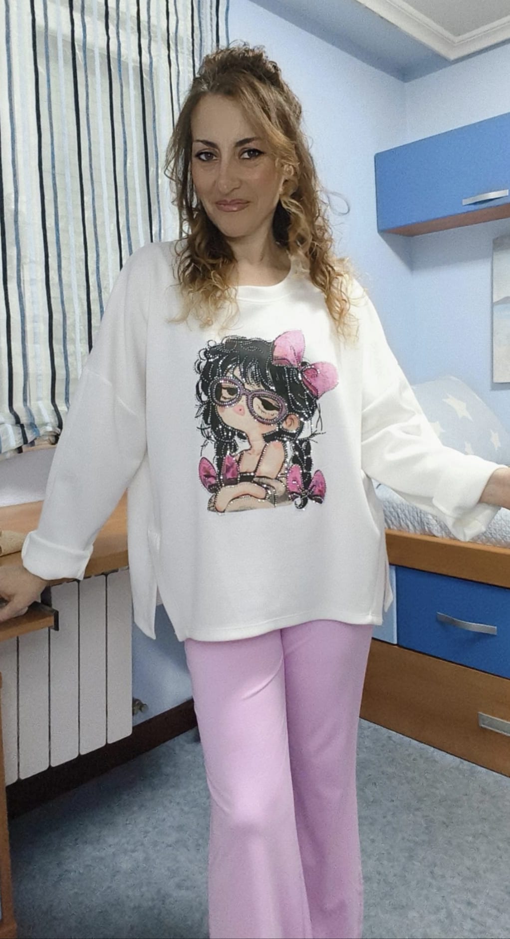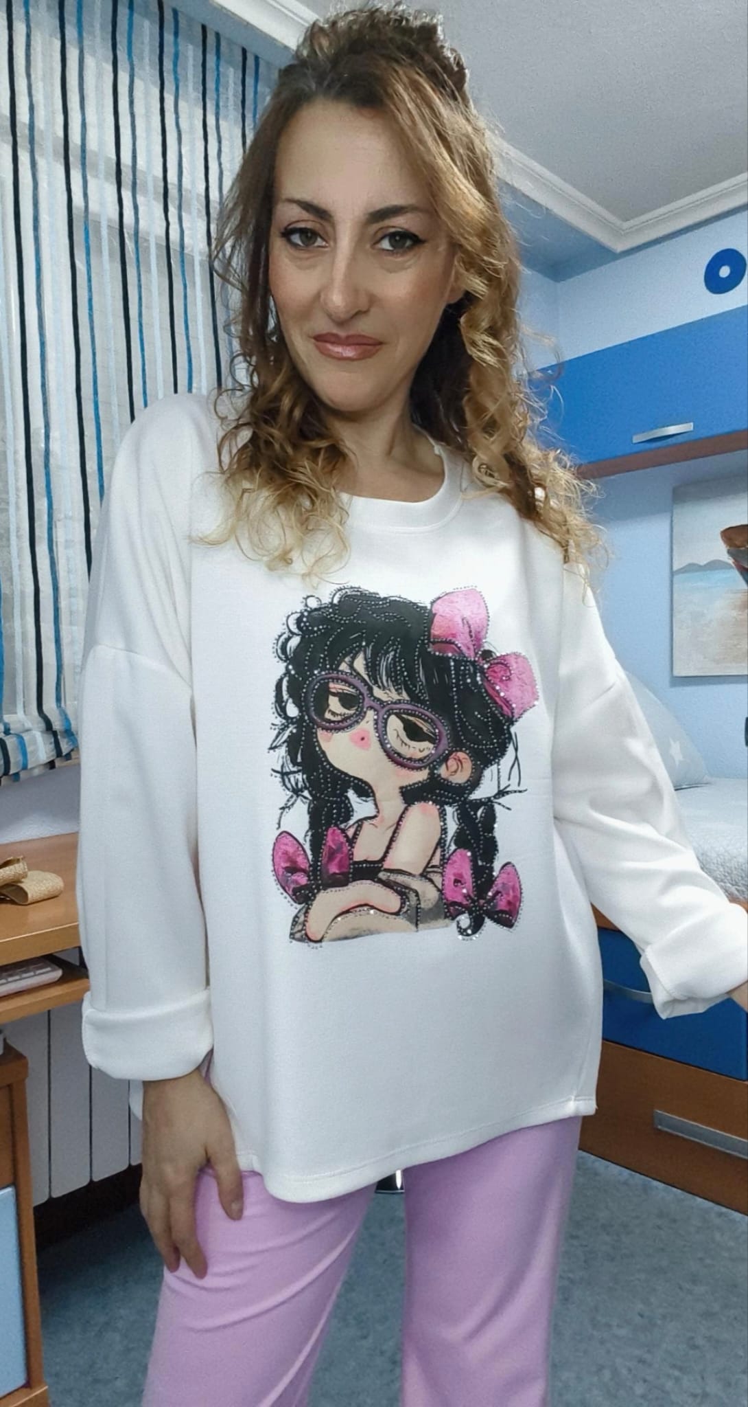 Sudadera firma Milano con dibujo de muñeca en la parte delantera con detalles de strass. Talla única ideal hasta talla 44-