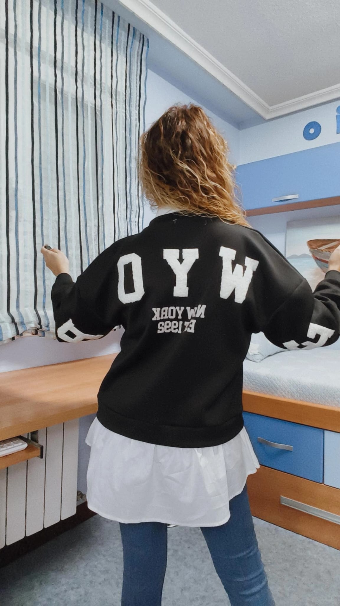 Sudadera negra talla única. Hasta 115 cm de contorno de pecho. Efecto de camisa interior porque tiene incorporada una solapa y una blonda blanca de camisa. Ideal y súper cómoda pero con un toque diferente.