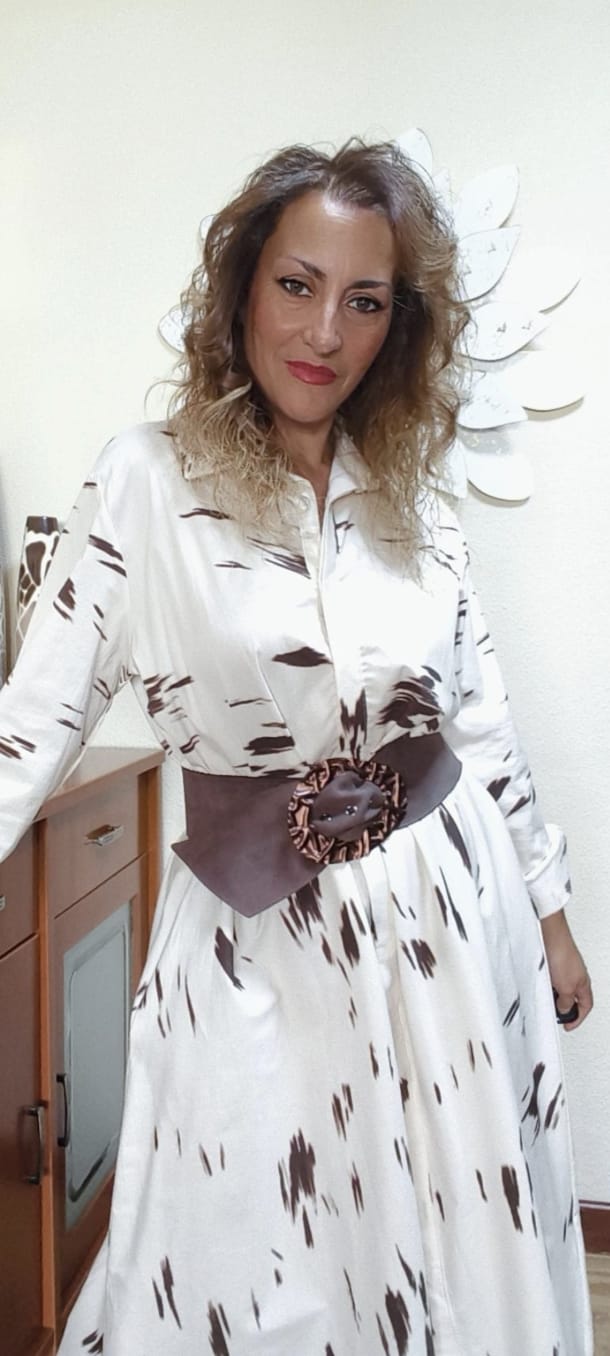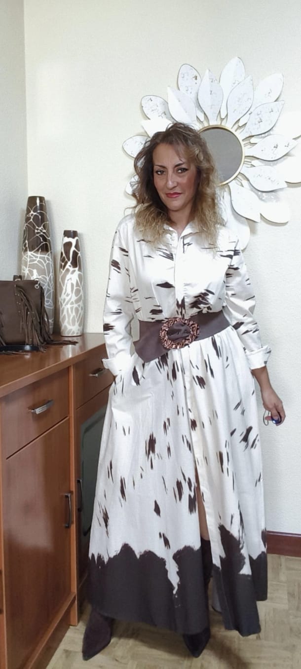 Vestido camisero de la firma JOT que incluye un cinturón estrecho, no el de la imagen. Talla única ideal hasta 105 de contorno. Tela en un color blanco roto con detalles chocolate. Elegante. Con bolsillos.
