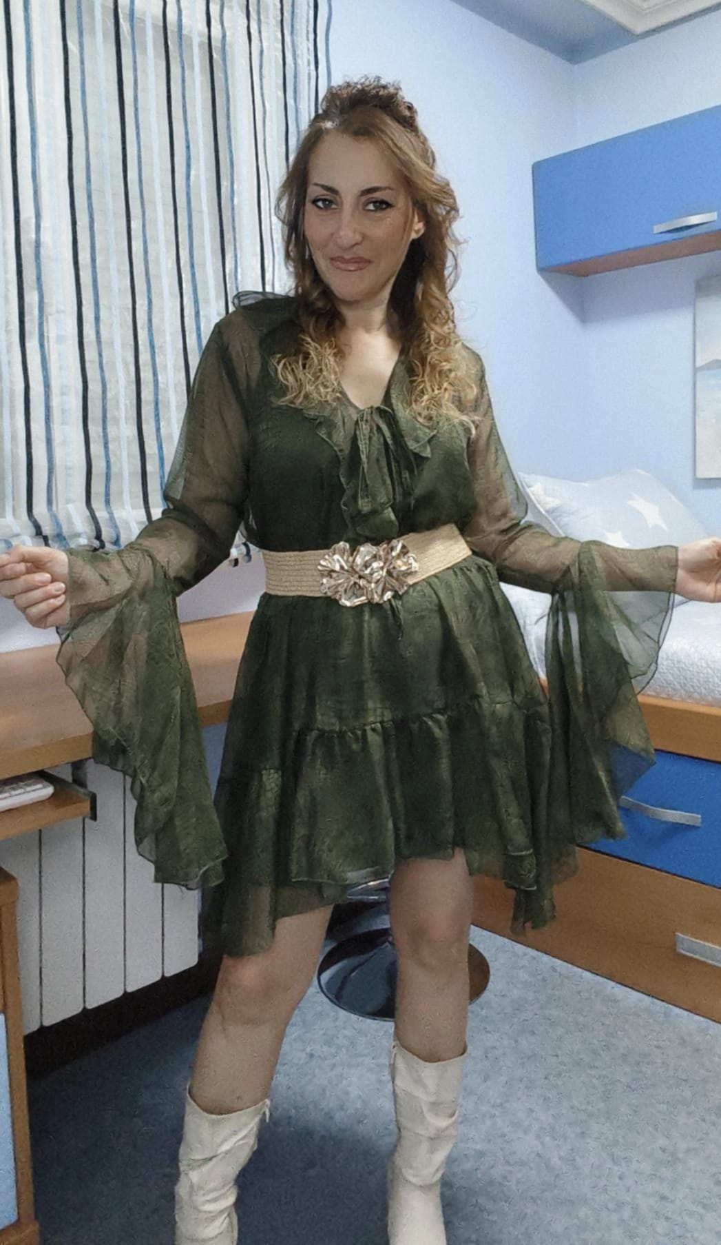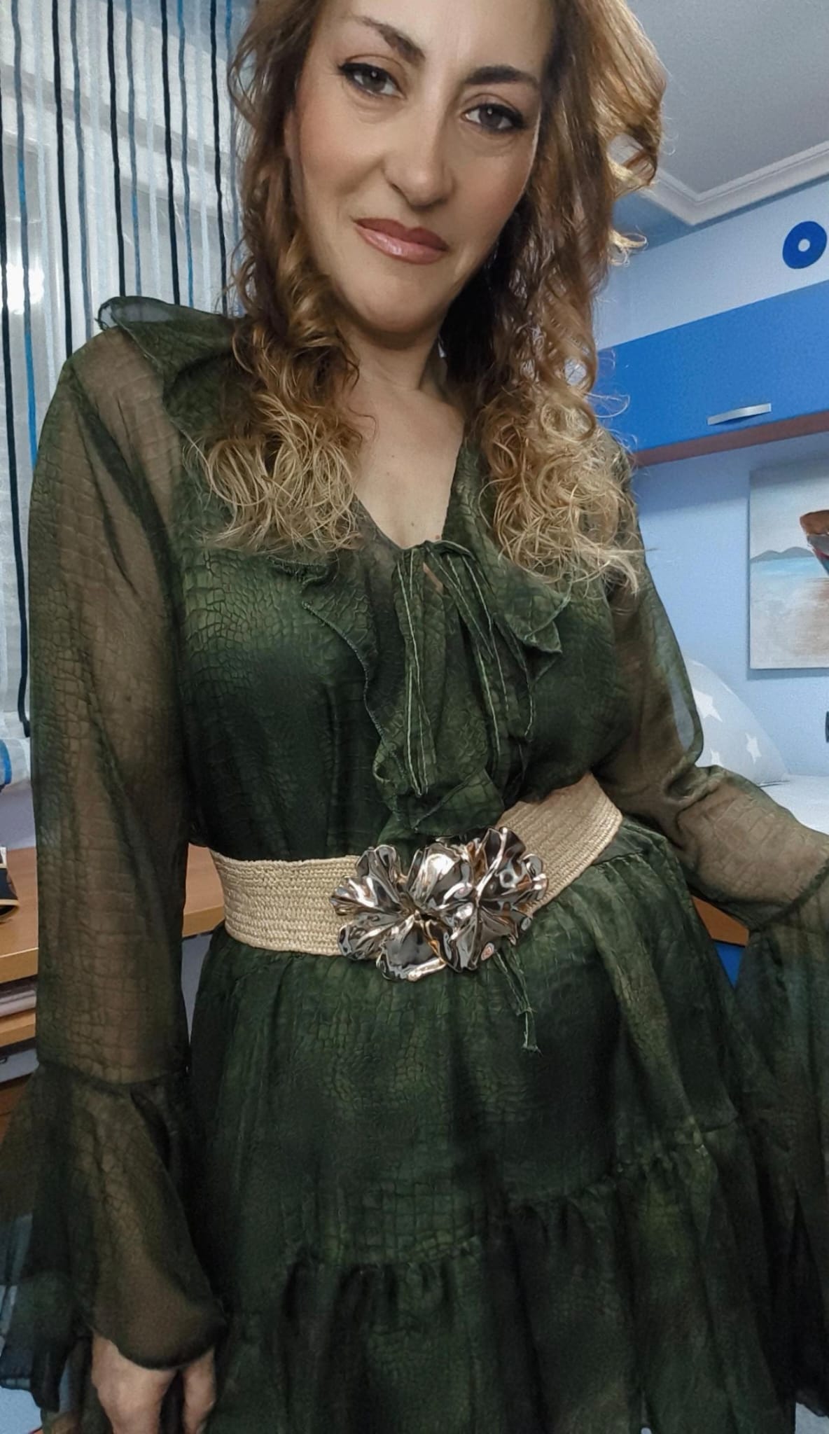 Vestido de gasa verde con forro interior. Detalle de volante en el escote. Se puede utilizar con cinturón para estilizar o suelto- Talla única. Medida de contorno de pecho hasta 105 centímetros. Medida de largo 82 centímetros.